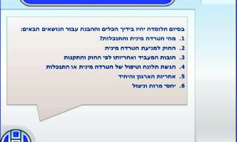 במסגרת לומדה זו יכיר איש האבטחה מהי הטרדה מינית, כיצד להימנע מפעולות שיחשבו כהטרדה מינית, חובות המעסיק ואחריותו לפי החוק, כיצד מתלוננים במקרה של הטרדה מינית או התנכלות ואיך מטפלים במקרה, כיצד על המעסיק לפעול במקרים של הטרדה מינית או התנכלות.