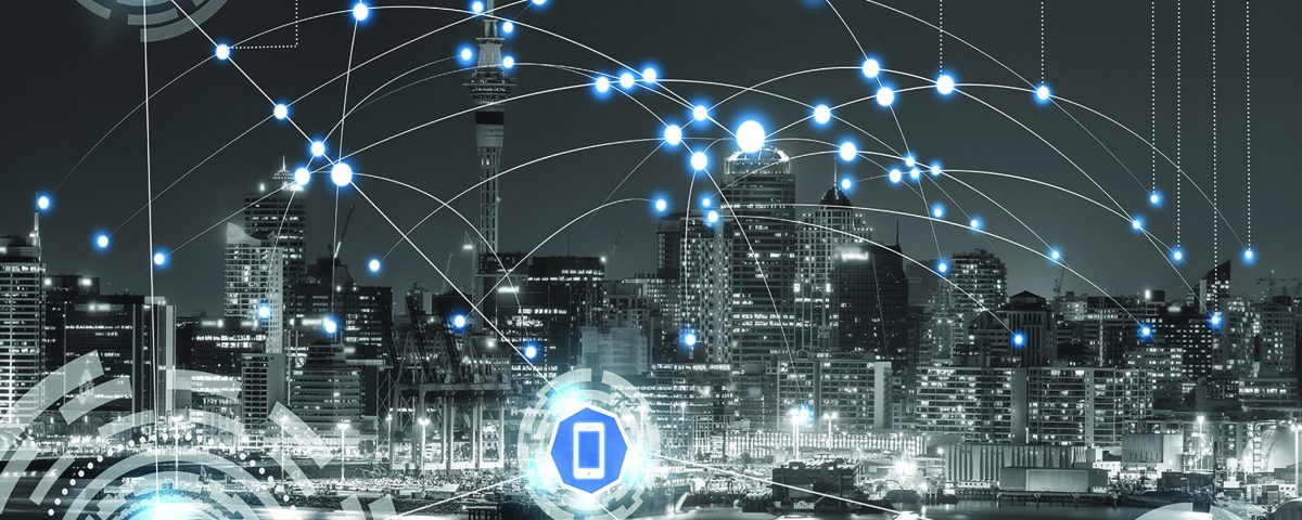 Smart city wireless communication network with graphic showing concept of internet of things ( IOT ) and information communication technology ( ICT ) against modern city buildings in the background.